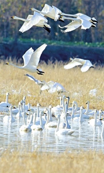 当1万多只小天鹅抵达网湖湿地时,它们4万只同类也同时抵达了200公里外的黄冈龙感湖湿地。