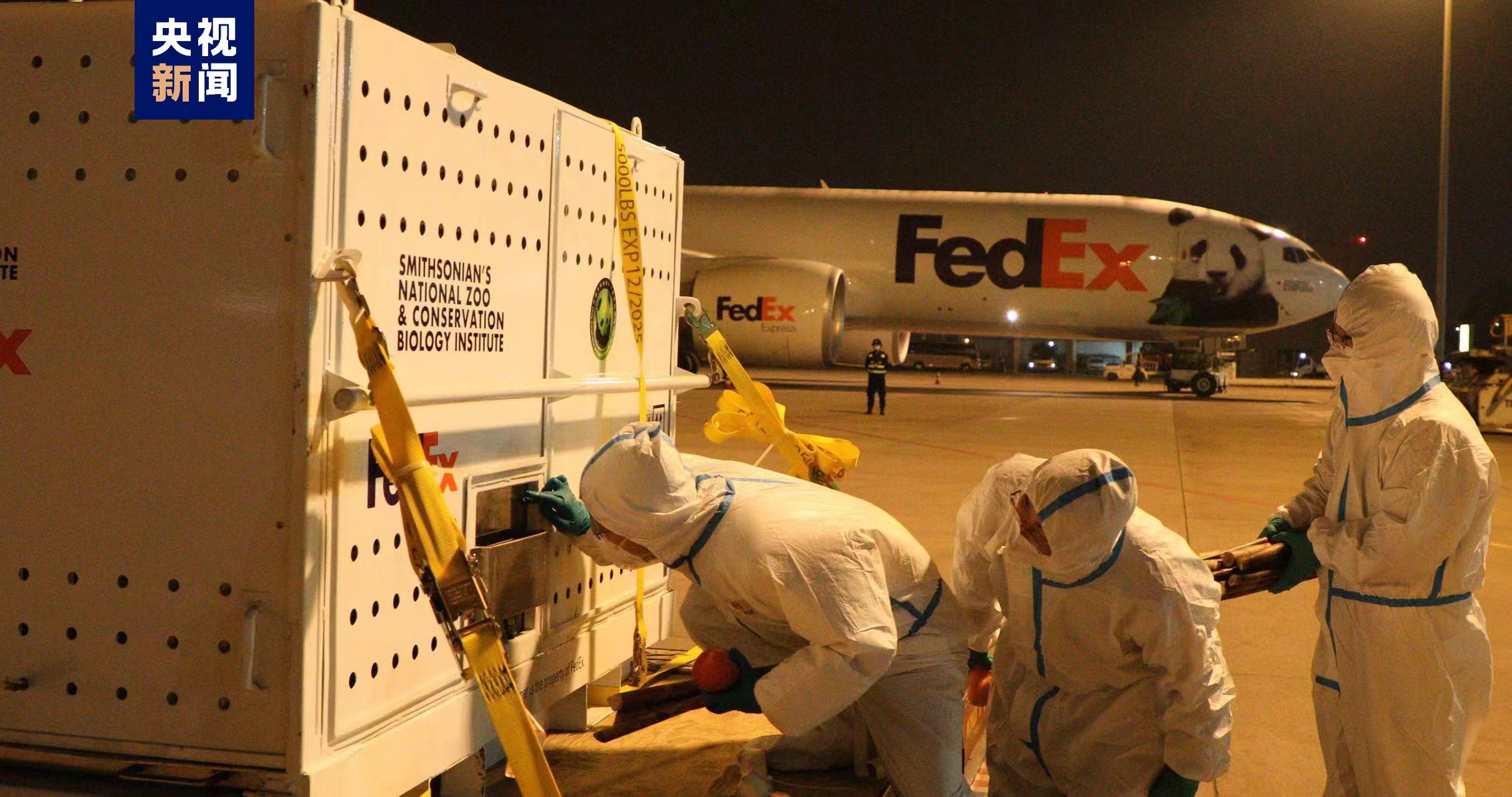 北京时间11月9日,旅美大熊猫“美香”“添添”“小奇迹”顺利抵达成都双流国际机场,在中方兽医和饲养员等工作人员陪护下,前往中国大熊猫保护研究中心卧龙神树坪基地封闭隔离检疫区。