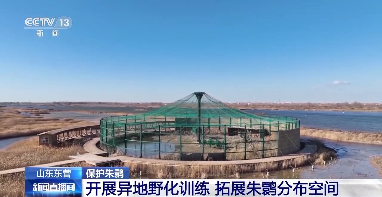 现在我们看到的就是朱鹮的野化适应笼,它的面积约3300平方米,顶高15米,工作人员在里边设置了盐沼、芦苇、灌木等,模拟黄河三角洲湿地生态环境。