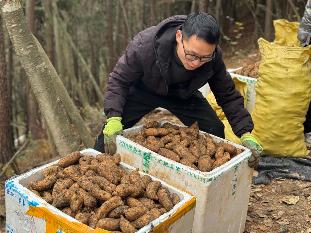 工作人员正在搬运一箱新鲜天麻。新华社记者赵佳乐 摄
