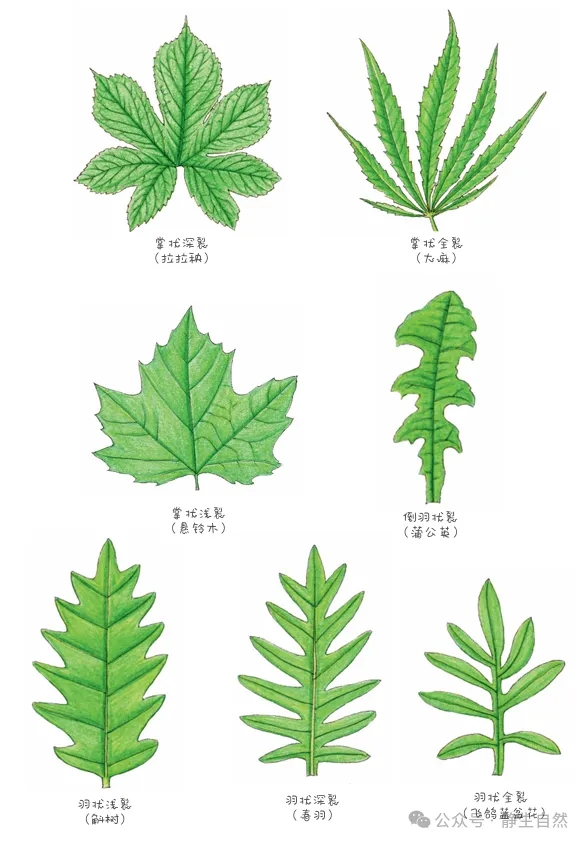 浅裂的叶片缺刻最深不超过叶片的 1/2;深裂的叶片缺刻超过叶片的 1/2 但未达中脉或叶的基部;全裂的叶片缺刻则深达中脉或叶的基部,是单叶与复叶的过渡类型,有时与复叶并无明显界限。