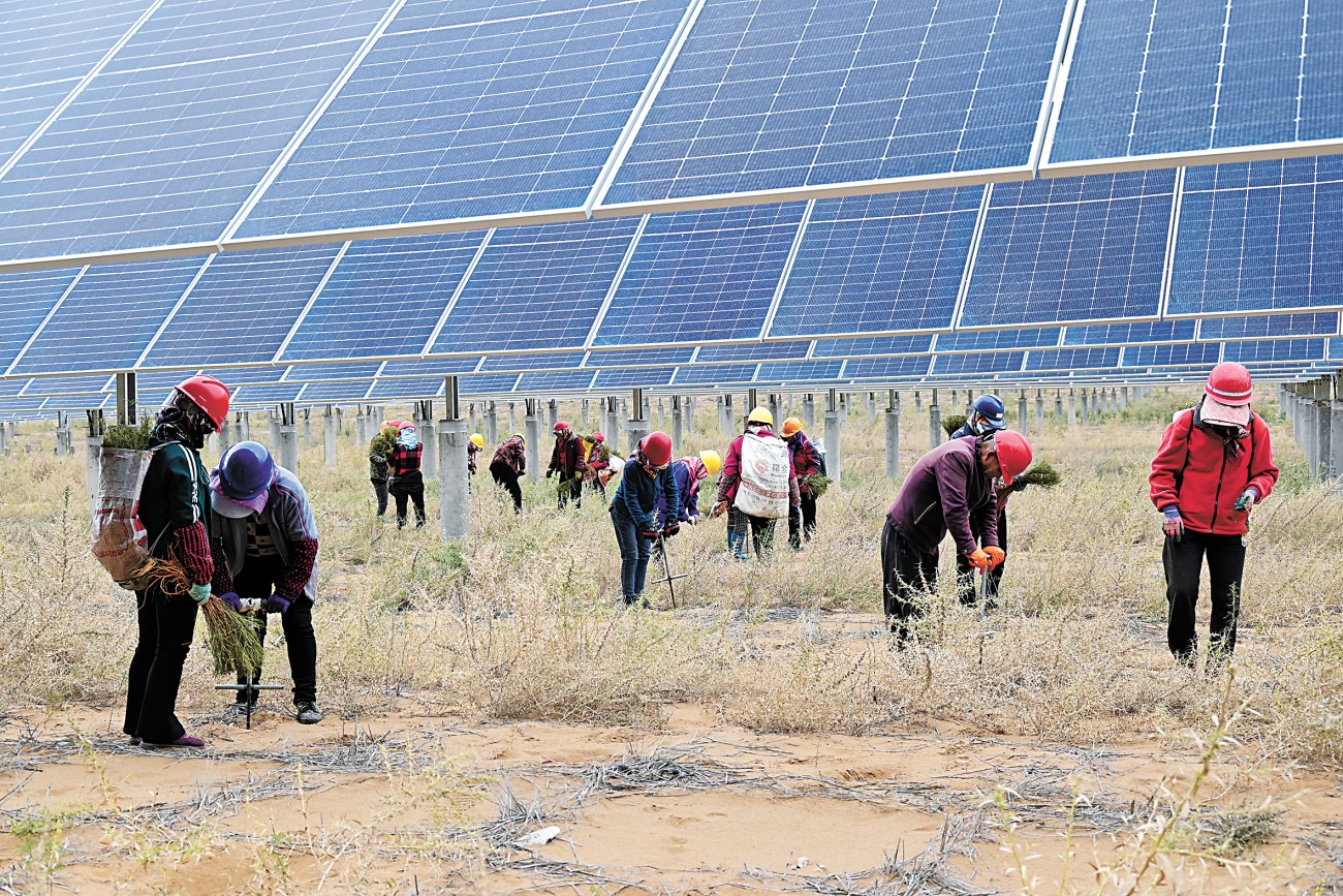 光伏板下种植柠条、花棒等灌木。潘战国摄