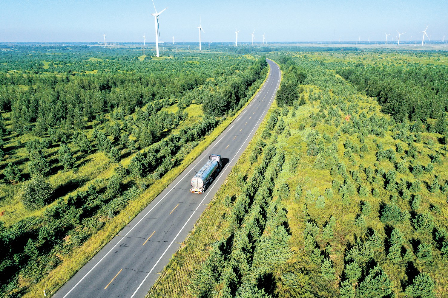 目前,翁牛特旗已贯通17条穿沙公路,总里程494.5公里,形成“六横十一纵”的治沙网格体系,累计完成沙地综合治理560万亩。其中,乌白公路通车后,货运成本降低约40%,直接或间接带动近8万名沿线群众增产增收。