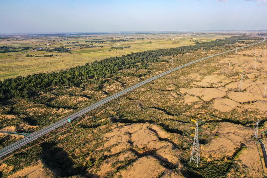 这是9月10日拍摄的库布其沙漠北缘锁边林带(无人机照片)。新华社记者 李志鹏 摄