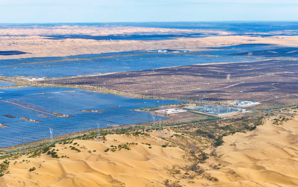 9月16日拍摄的库布其沙漠鄂尔多斯中北部新能源基地先导工程(无人机照片)。(王正 摄)