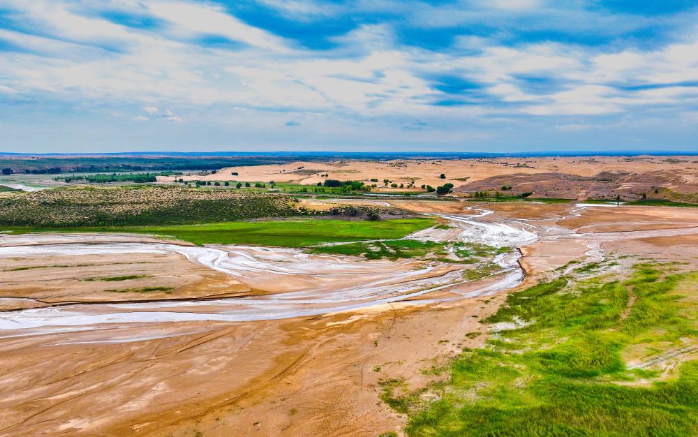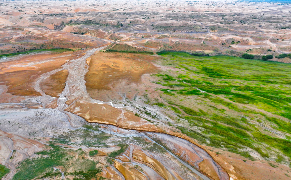9月16日拍摄的库布其沙漠鄂尔多斯市达拉特旗黑赖沟孔兑综合治理区景色(无人机照片)。(王正 摄)