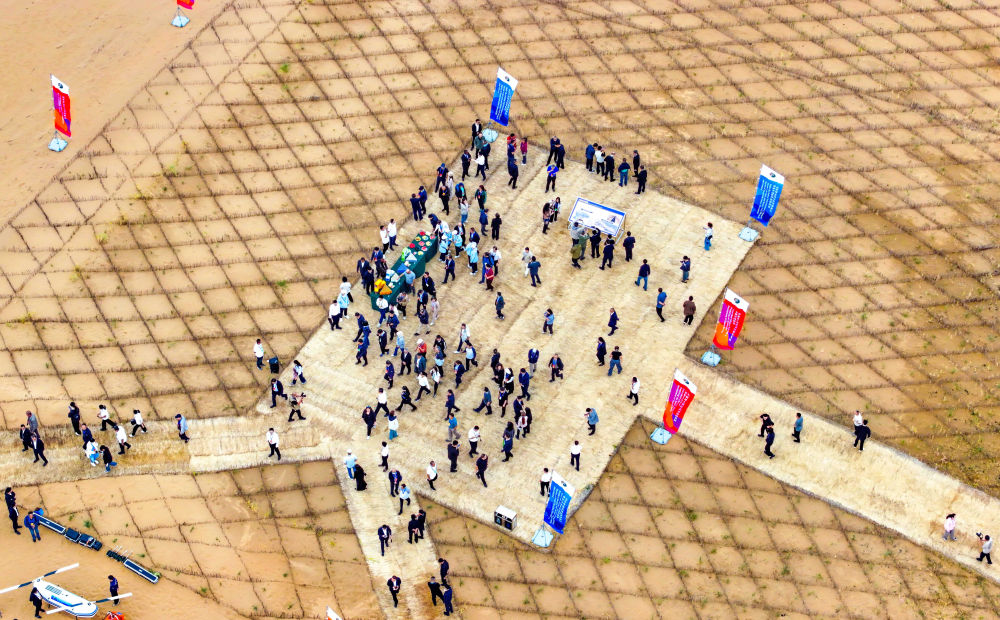 9月16日,第十届库布其国际沙漠论坛与会者参观库布其沙漠鄂尔多斯市达拉特旗以路治沙示范区(无人机照片)。(王正 摄)