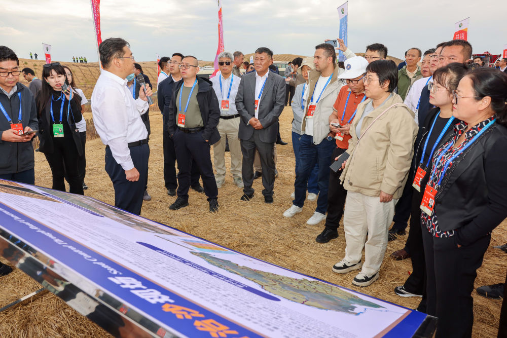 9月16日,在鄂尔多斯市达拉特旗以路治沙示范区参观点,达拉特旗委副书记、旗长张伟雄向第十届库布其国际沙漠论坛与会者介绍治沙经验成果。(赵鑫磊 摄)