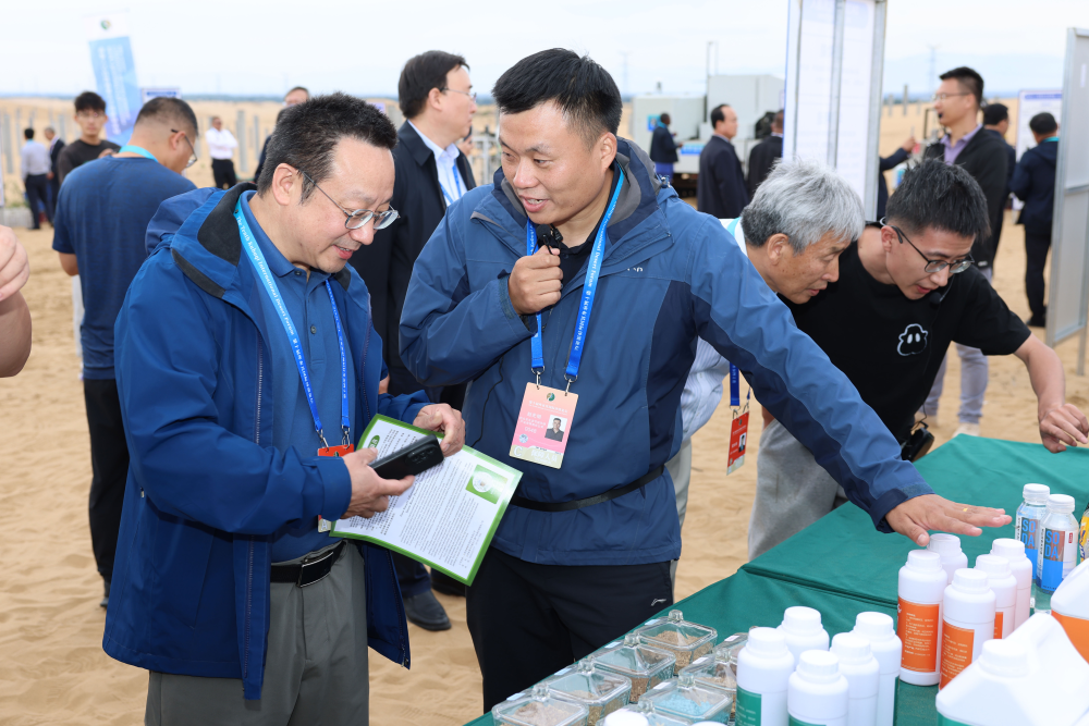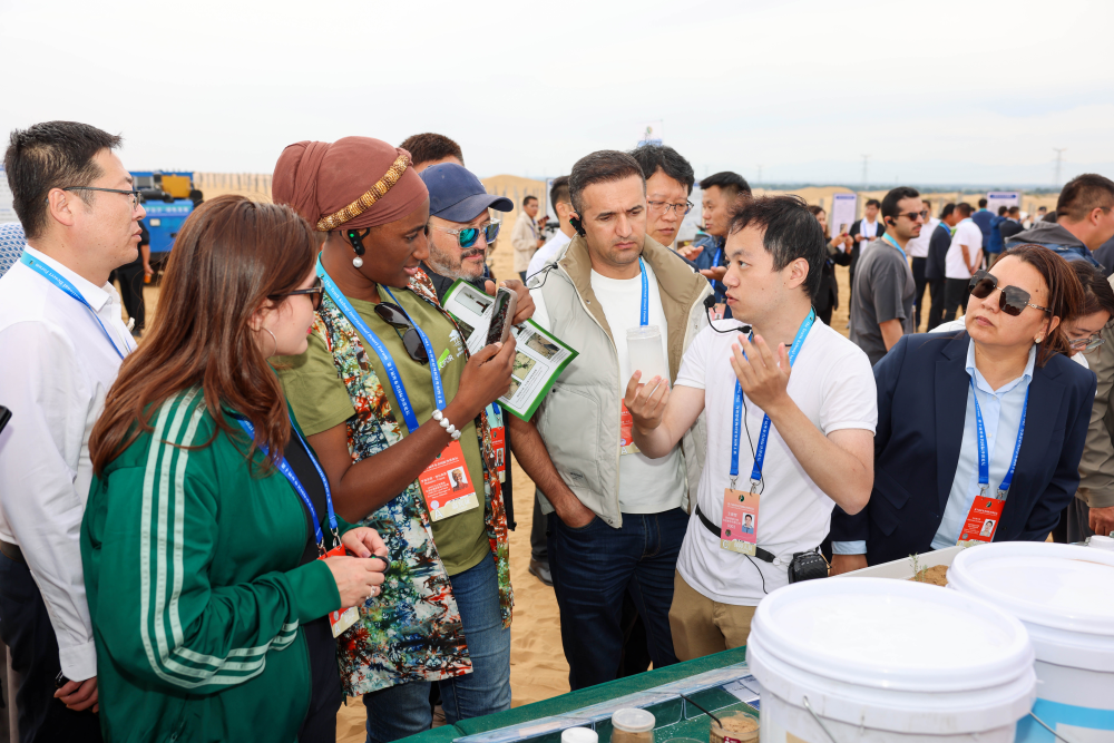 9月16日,在以路治沙示范区参观点,工作人员为第十届库布其国际沙漠论坛与会者介绍沙生植物产品。(赵鑫磊 摄)