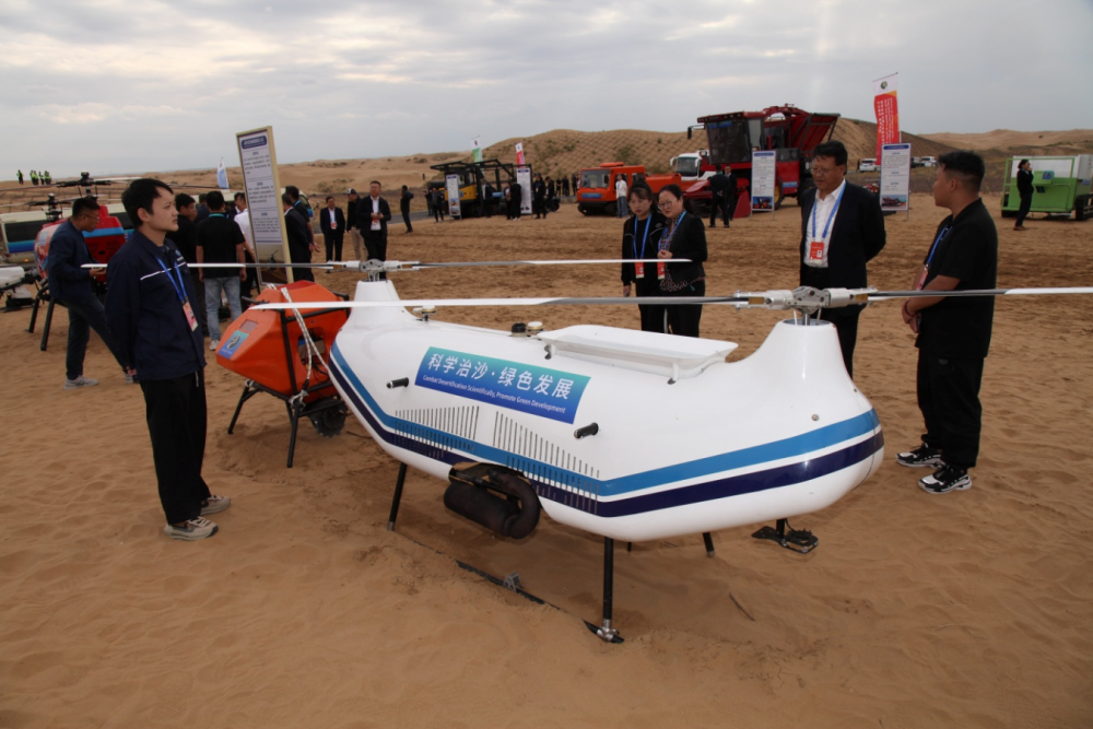 9月16日,鄂尔多斯市达拉特旗以路治沙示范区工作人员向第十届库布其国际沙漠论坛与会者展示纵列式双旋翼载重无人机。(李爱武 摄)
