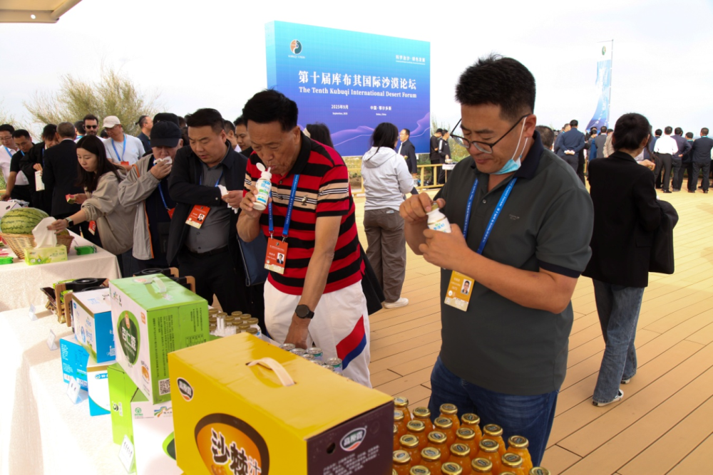 9月16日,第十届库布其国际沙漠论坛与会者品尝沙漠特色食品。(李爱武 摄)