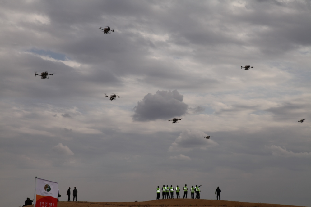 9月16日,鄂尔多斯市达拉特旗以路治沙示范区工作人员进行无人机飞播演示。(李爱武 摄)
