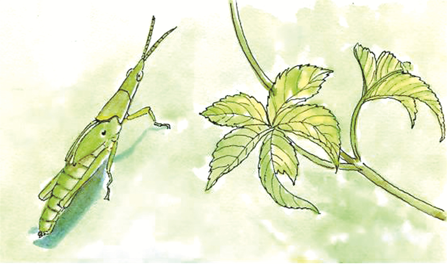 节气到了处暑时,葎草丛里常能见到很多正处于“青少年”时期的短额负蝗。它们的体型已接近成年,但还没长出长长的能覆盖腹部的翅膀,只有短短的翅芽,看上去衣不蔽体。不过,它们现在通体绿色,在遇到危险时只要纵身一跃,便能轻易地隐身于草丛中。