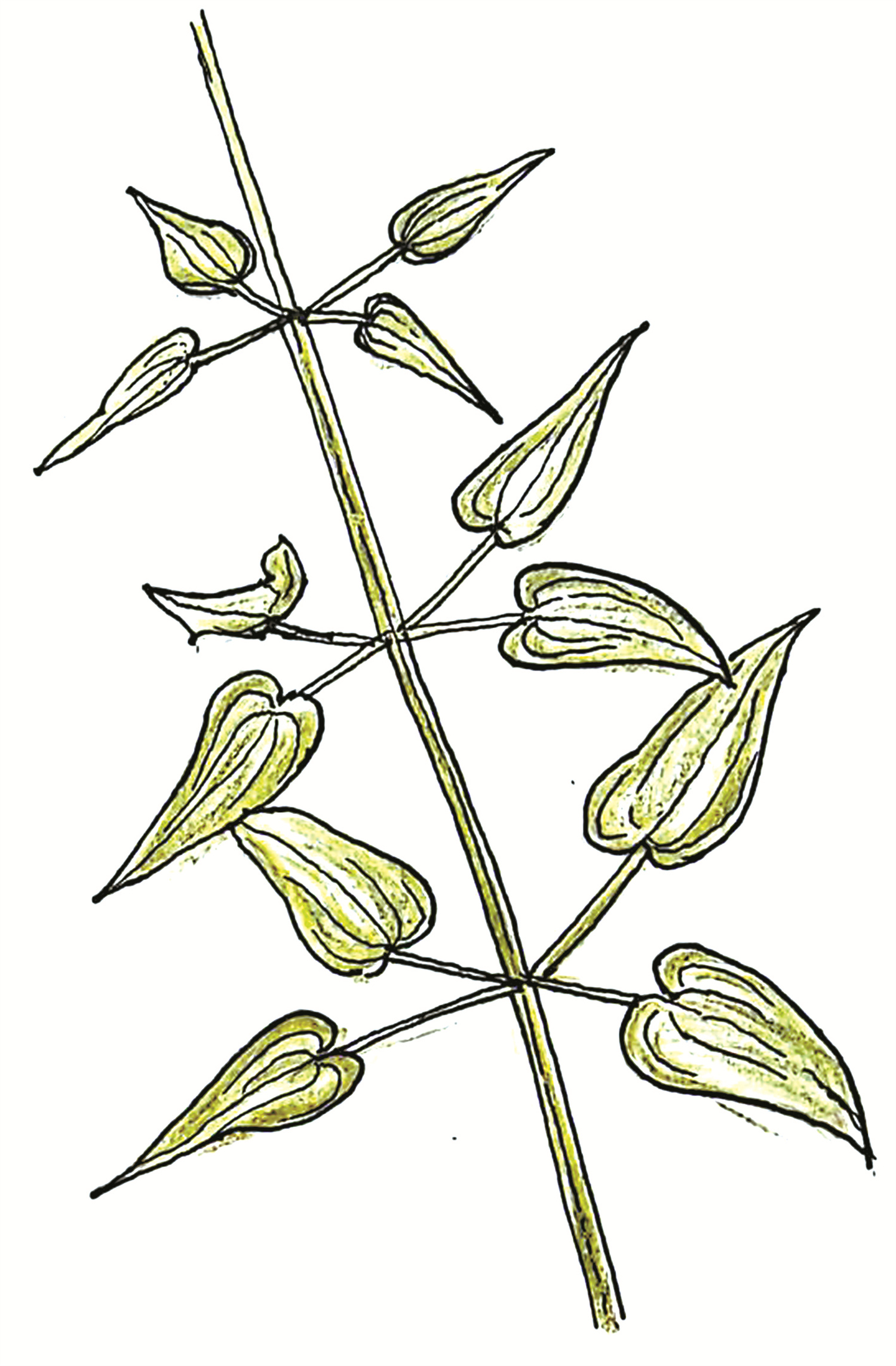 茜草是一种十分常见的杂草,茎秆和叶柄上有倒生的皮刺,借此攀缘生长,因此看到茜草需要非常小心,否则可能会被它的皮刺割伤。茜草叶片的着生方式很有特点,4枚叶片轮生,长长的叶柄朝着不同的方向伸展,像一个绿色的小风车。