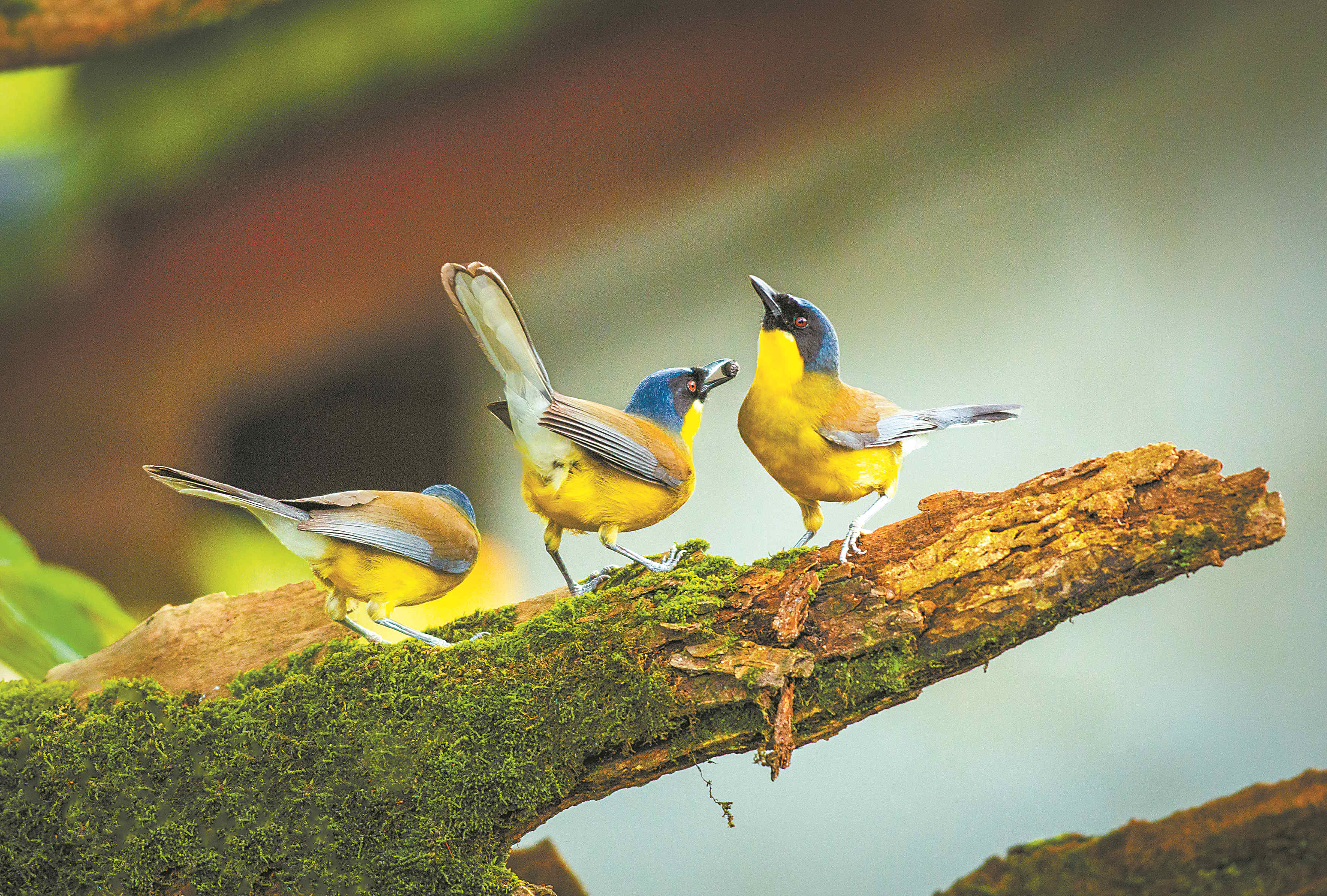 天刚亮,婺源森林鸟类国家级自然保护区的工作人员按照惯例在森林里进行巡查,几声清脆的鸟鸣打破了清晨的宁静。工作人员抬头望去,见3只蓝冠噪鹛正在树梢上打量着他们。