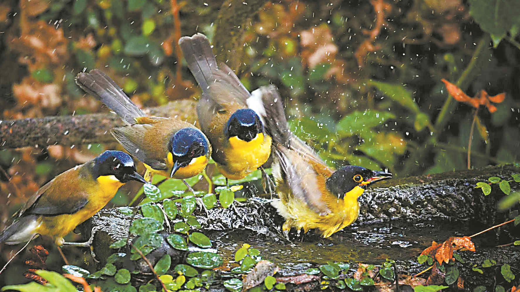 四只蓝冠噪鹛在水边嬉闹