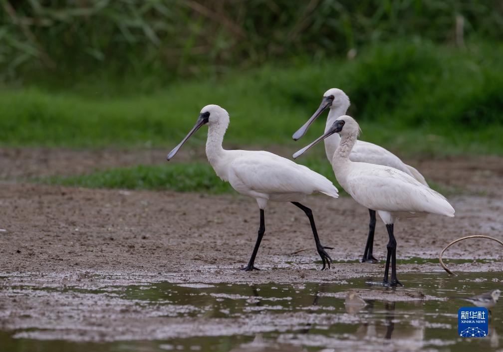 三只国家一级重点保护野生动物黑脸琵鹭在福州长乐闽江河口湿地停歇(11月15日摄)。新华社记者 魏培全 摄
