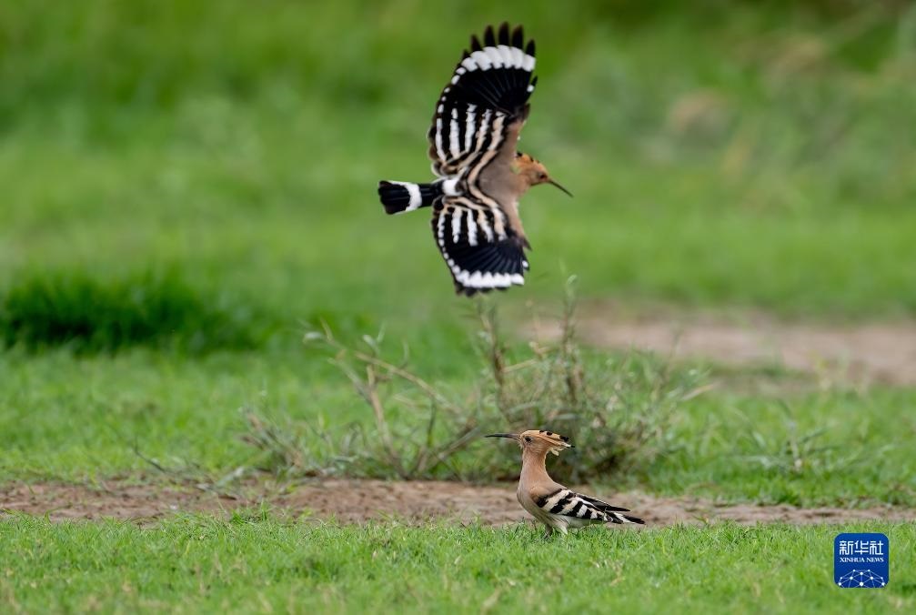 两只戴胜鸟在福州长乐闽江河口湿地打闹嬉戏(11月15日摄)。新华社记者 魏培全 摄