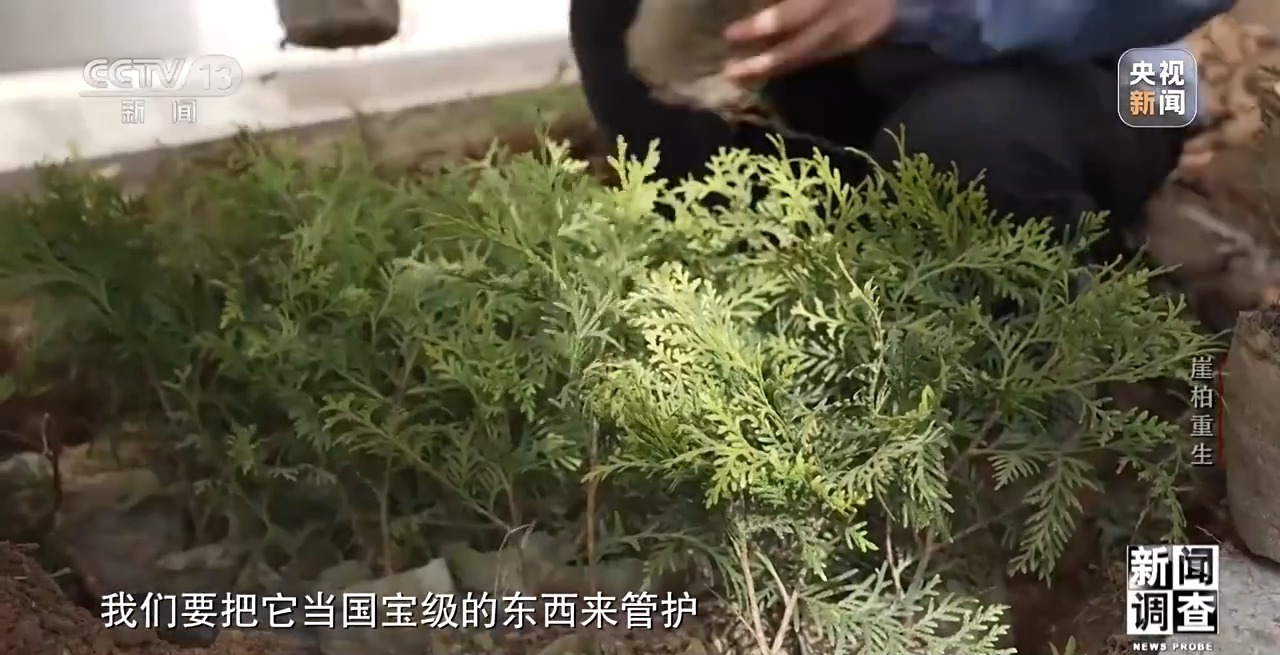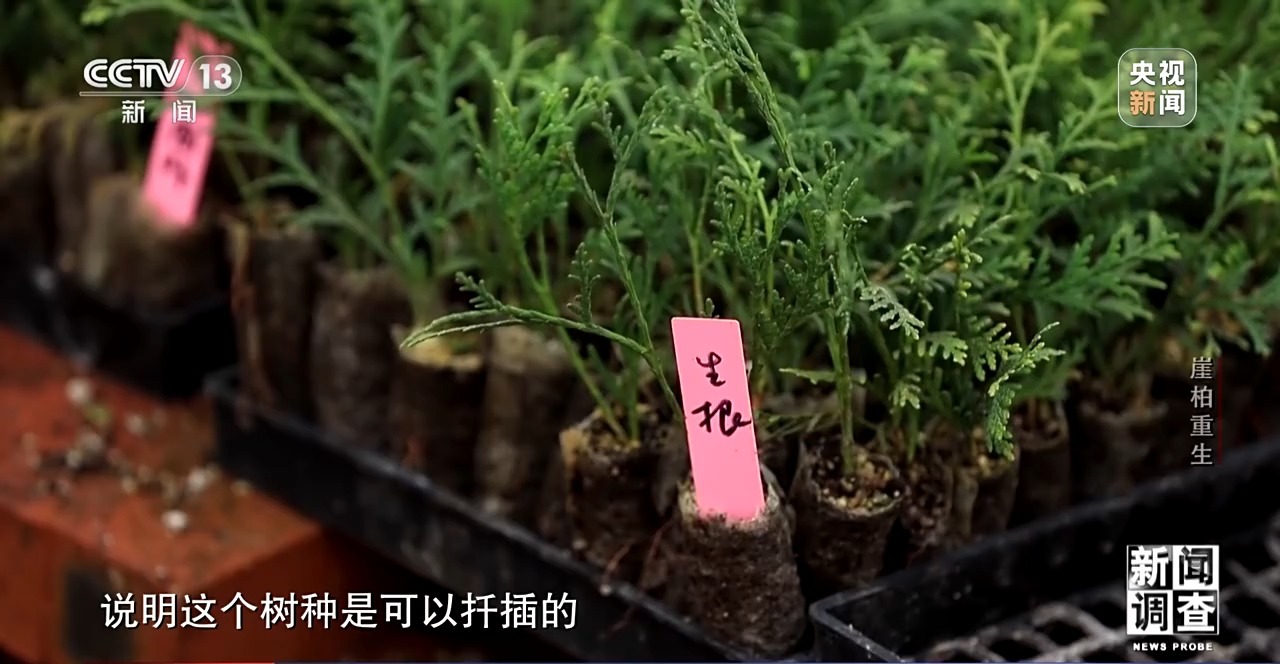 中国林科院森林生态环保所二级研究员 郭泉水:一个偶然的机会,从崖柏的小树上采集了一些穗条然后进行扦插,在同样的条件下,它的生根率达到了96%,说明这个树种是可以扦插的。